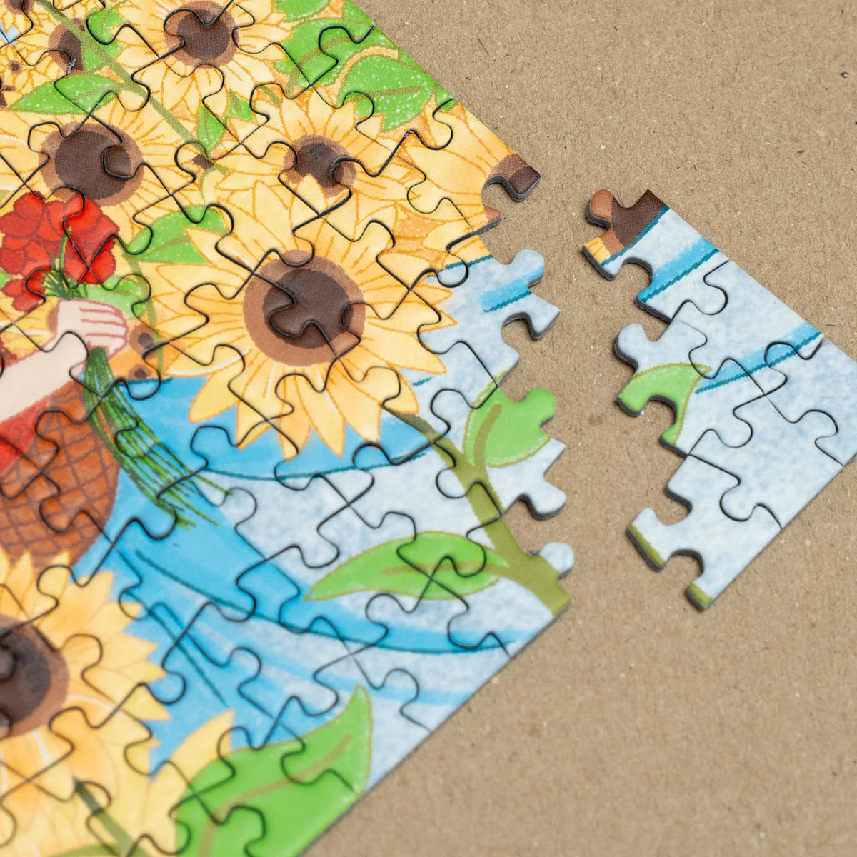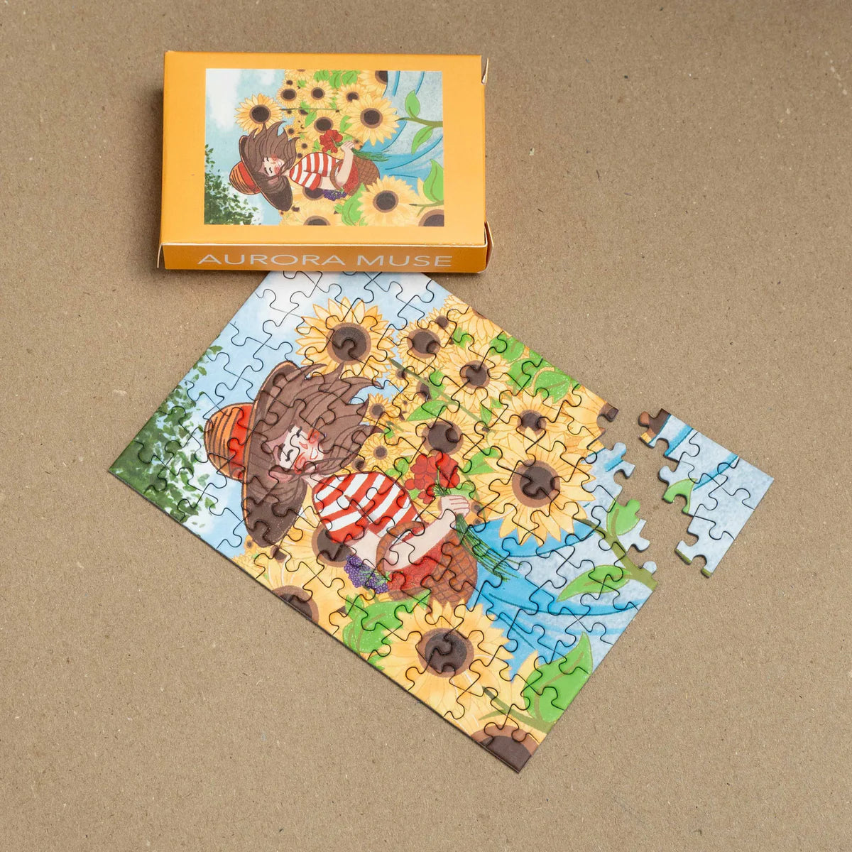 Dive into the splendor of a sunny day with this 99-piece mini puzzle featuring a woman in a sunflower field. With a bouquet of poppies in hand and the sun shining above, this scene captures the joy and beauty of nature in the height of summer.