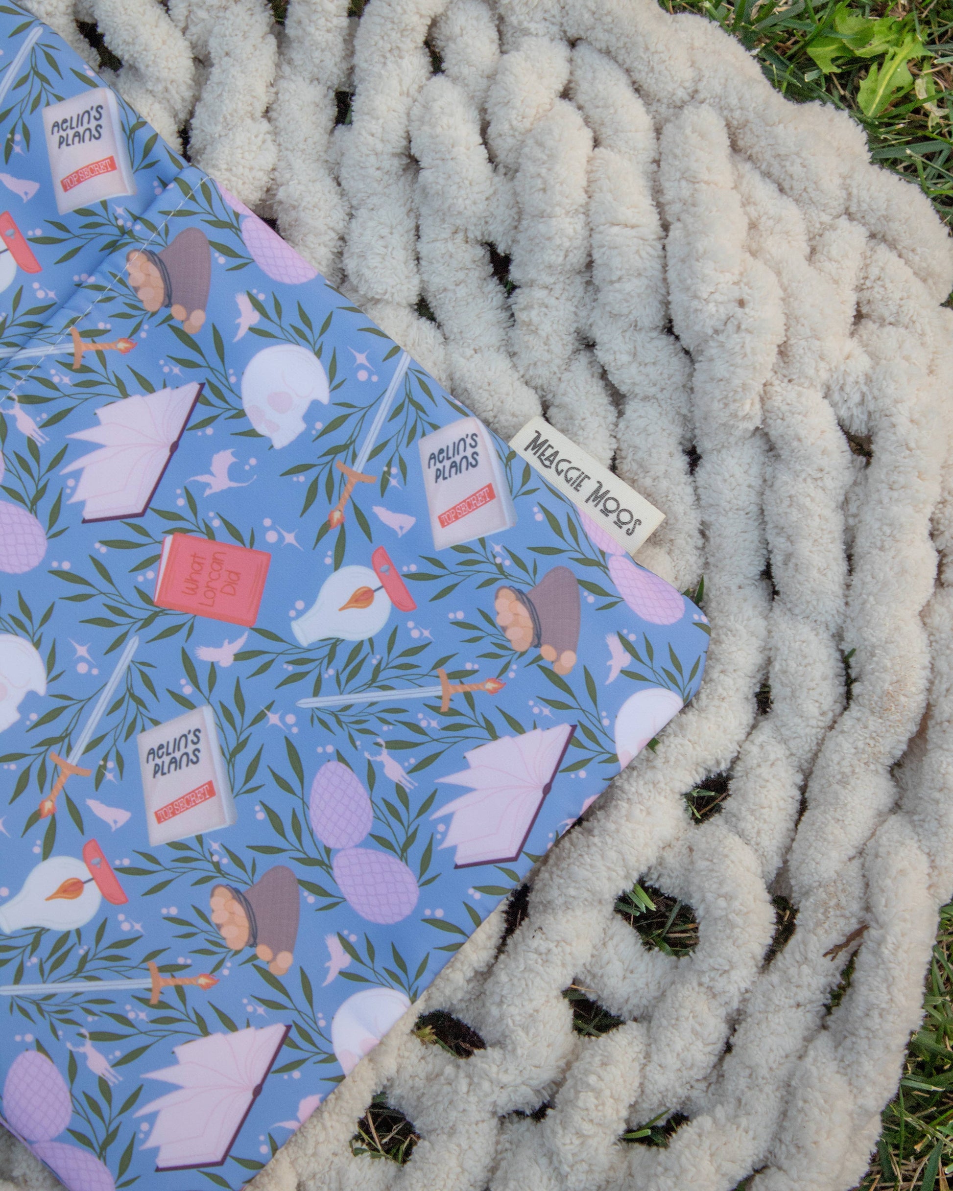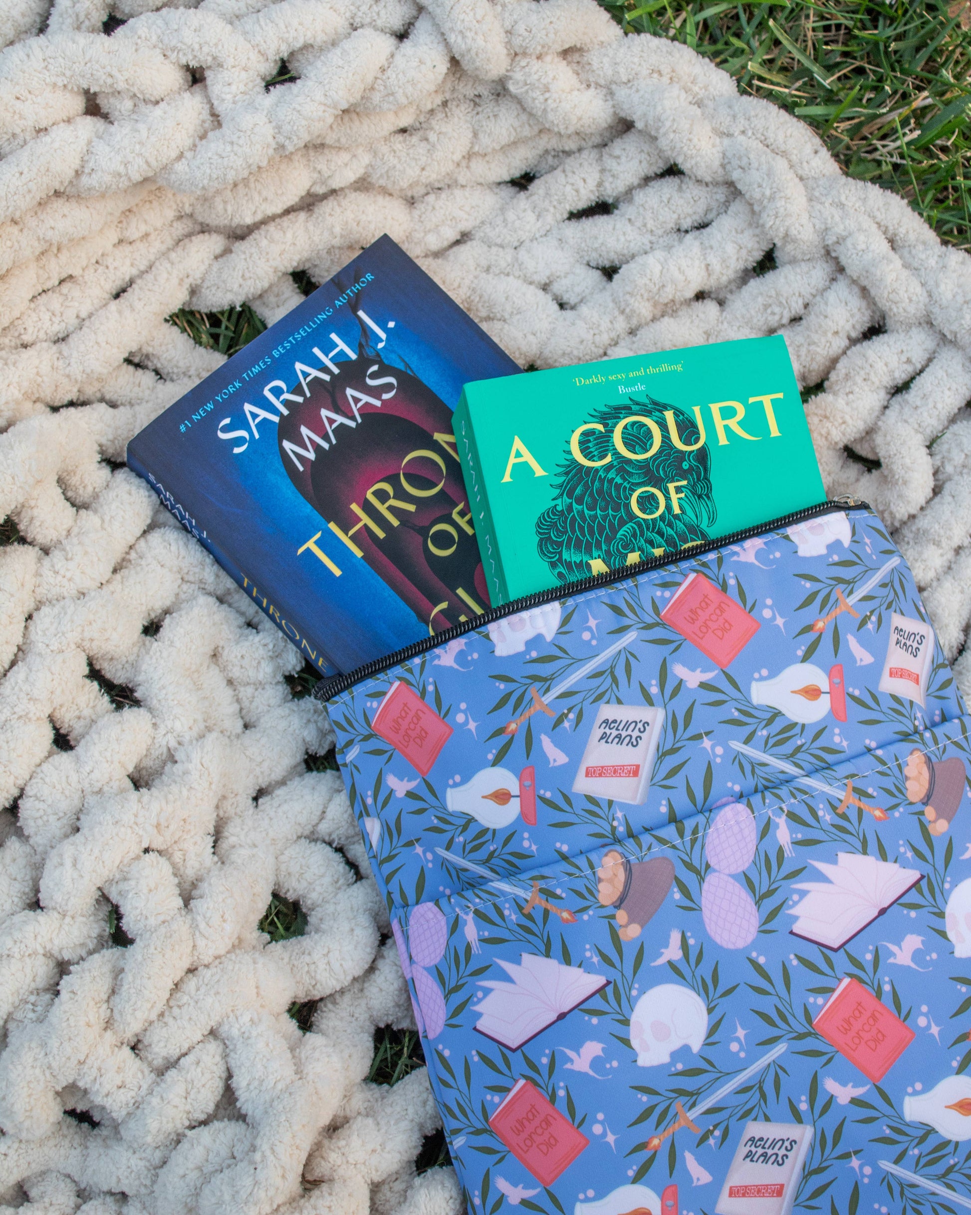 This large water-resistant book / tablet sleeve was designed by a reader for readers. This book sleeve is large enough to hold even the chonkiest of fantasy novels and will keep them safe along your travels. // Details // - 12.5"x9.75" - Water-Resistant (not waterproof, if it is submerged it will seep in through the seems. But you're safe from spills and rain!) - Sturdy silver colored metal zipper - Outside Front Pouch - Main pouch can fit up to hardcover HOFAS, or two paperback novels, and up to an IPad pro 12.9" - Front pouch can fit an IPad Air, a smaller paperback or a kindle. - Lightly padded From Throne of Glass, by Sarah J. Maas, © 2022. Artwork by Meagan Mathison. Created with permission of Writers House LLC acting as agent for the author. The art depicted on the products listed for sale is wholly original to me and has been approved by Sarah J. Maas for use on the products.