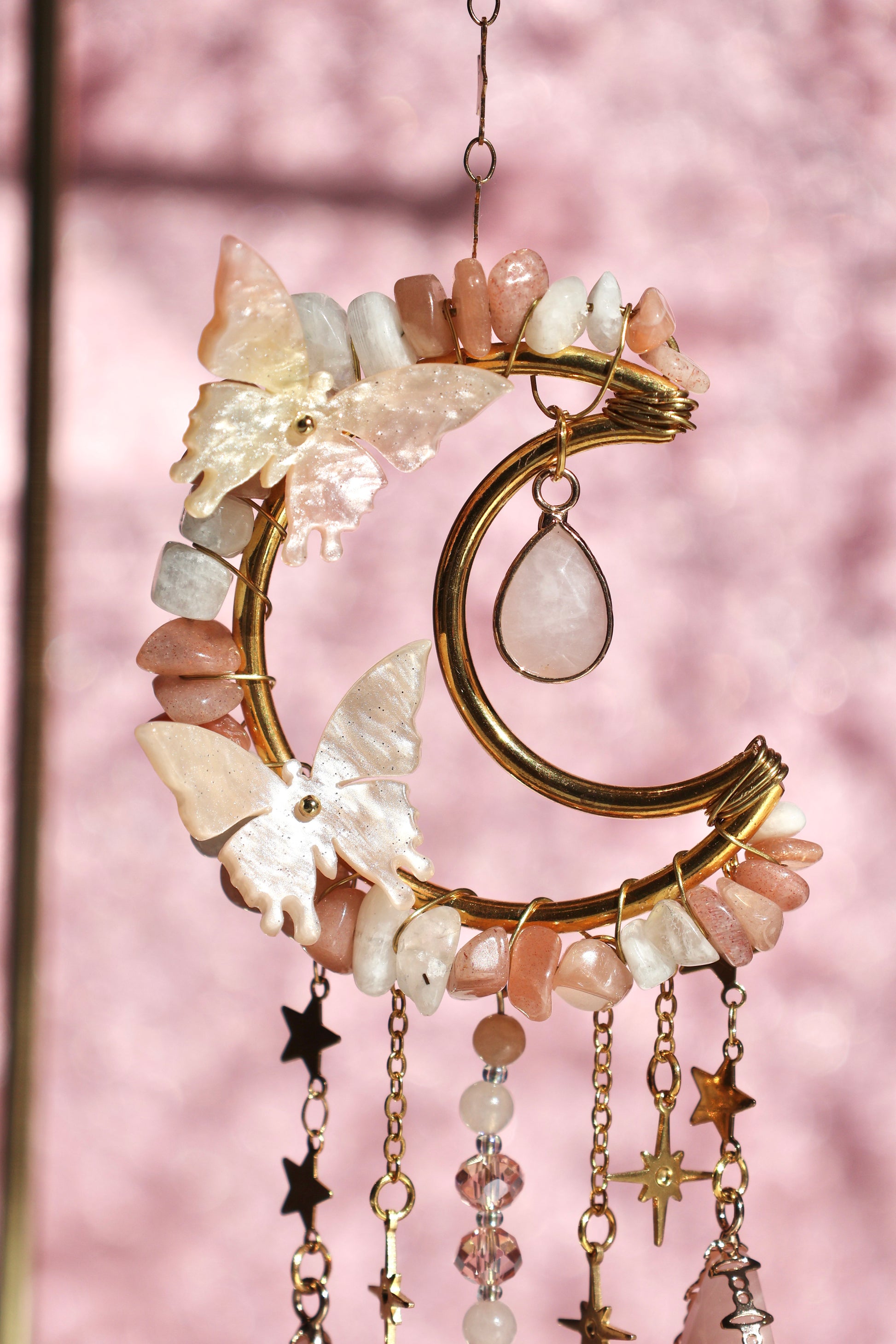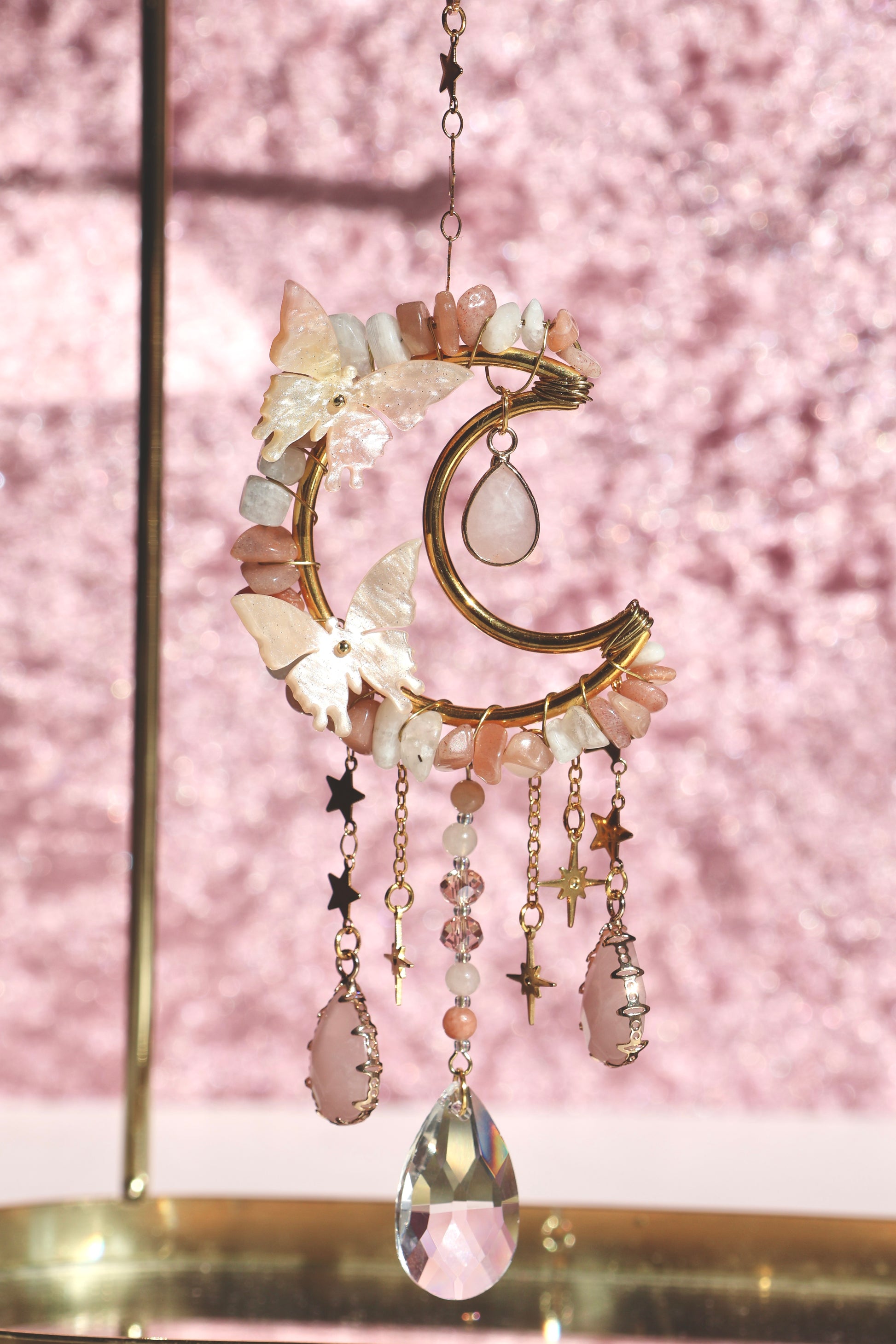 This Sun Catcher has a beautiful mix of Peach Moonstone, Moonstone, & Rose Quartz. 100% guaranteed to bring those good vibes ;)
