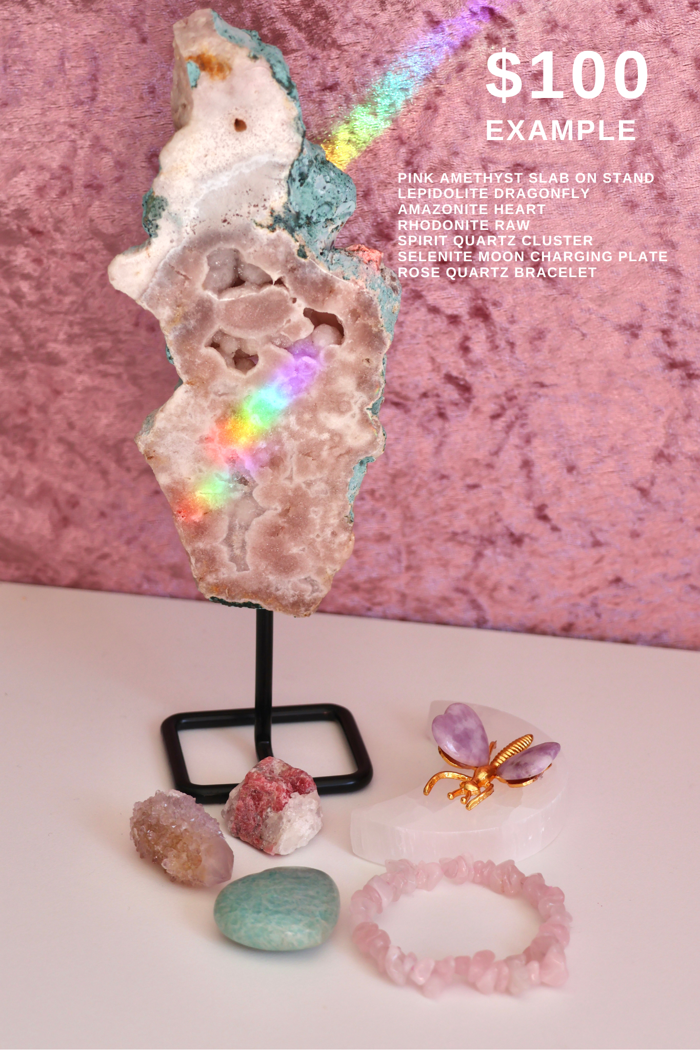 If purchasing a mystery box $50 & over, feel free to let us know if there is a specific intention or vibe you would like us to focus on, or if there is a specific crystal you already own and would not like to receive, please let us know in the note section at checkout. We will do our best to accommodate your request.