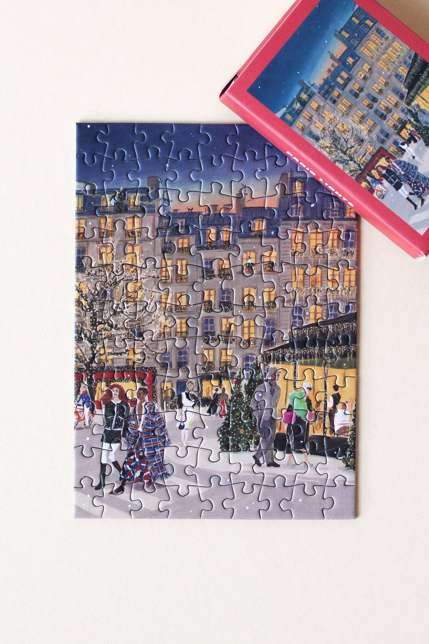 Experience the magic of Paris with our 99-piece Paris Lights mini puzzle, showcasing the festively decorated streets of the city during the Christmas season. Illuminated by sparkling fairy lights and populated by stylish pedestrians, this charming puzzle captures the sparkling evening atmosphere of Paris. Ideal for a cozy break and as a small Christmas gift. Illustrated by Yukiko Noritake.