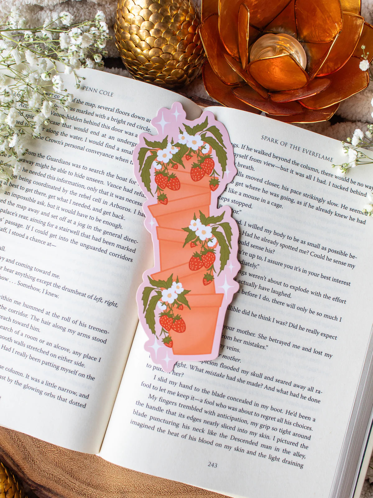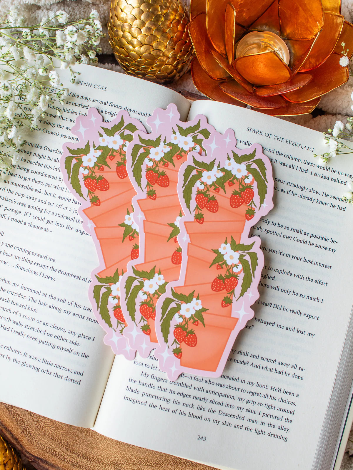 This die cut potted strawberries bookmark features a soft-touch coating that offers a luxurious feel. Made from double-sided 16pt cardstock, it adds a touch of whimsy to your reading experience. A must-have for book lovers, warm weather lovers, and fruit enthusiasts.