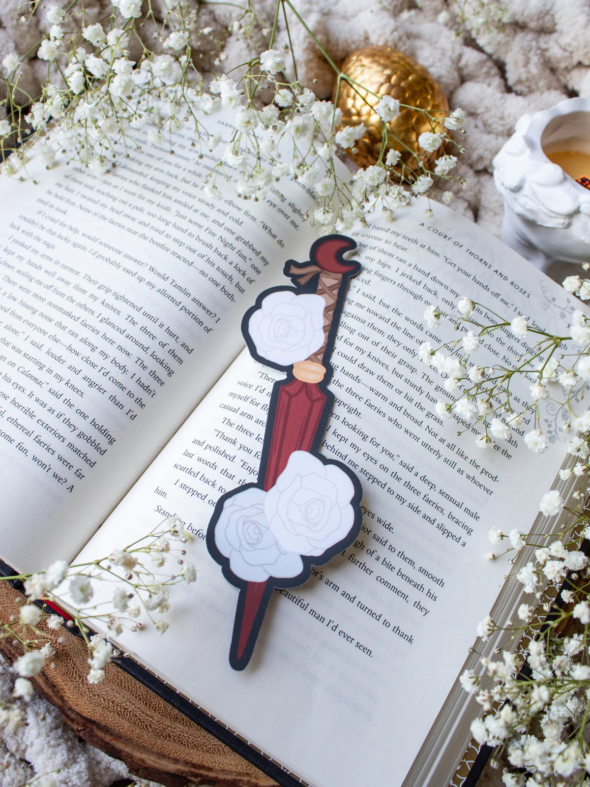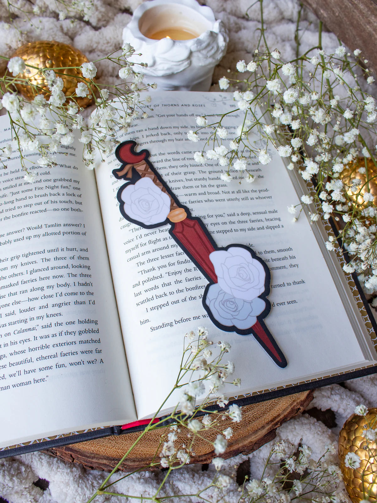 This die cut red floral dagger bookmark features a soft-touch coating that offers a luxurious feel. Made from double-sided 16pt cardstock, it adds a touch of whimsy to your reading experience. A must-have for book lovers and fantasy dagger enthusiasts.