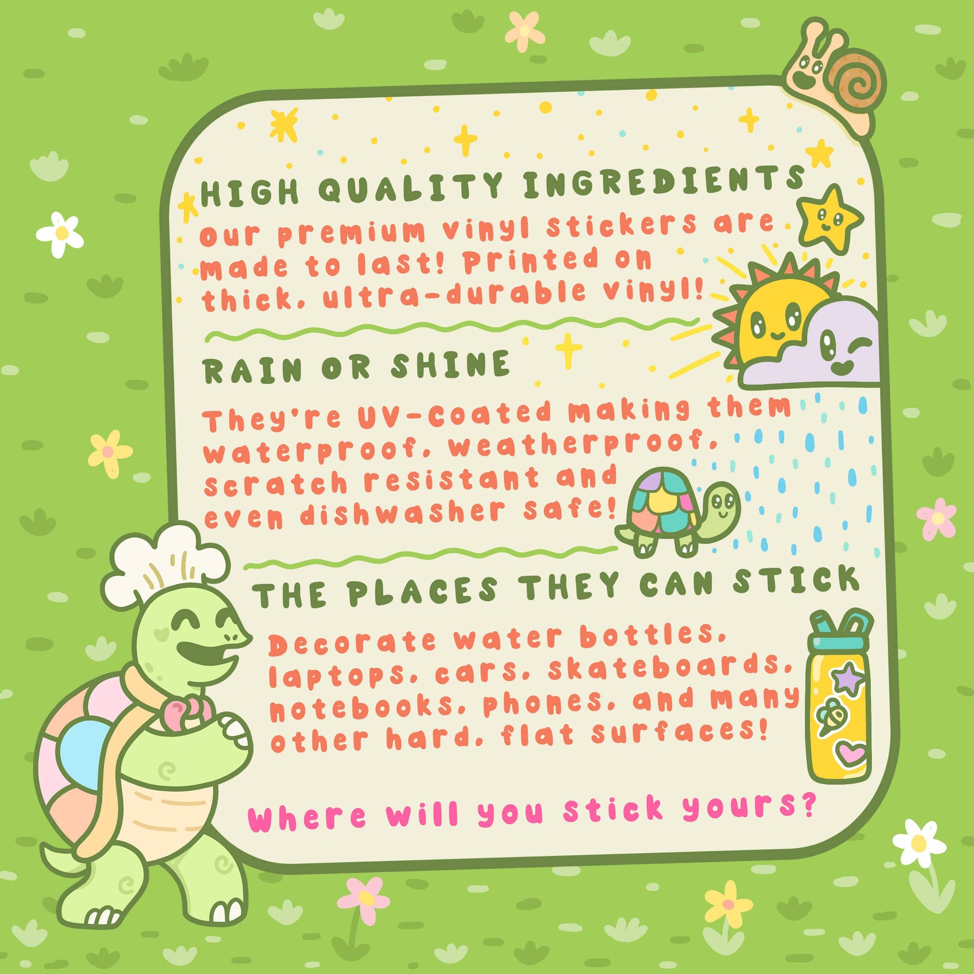 Our vinyl stickers are printed on Turtley Awesome premium vinyl with a permanent adhesive. Each one is coated with a protective laminate that makes them super durable & resistant to fading, scratching, tearing, and water. They can even be safely run through a dishwasher!💦
